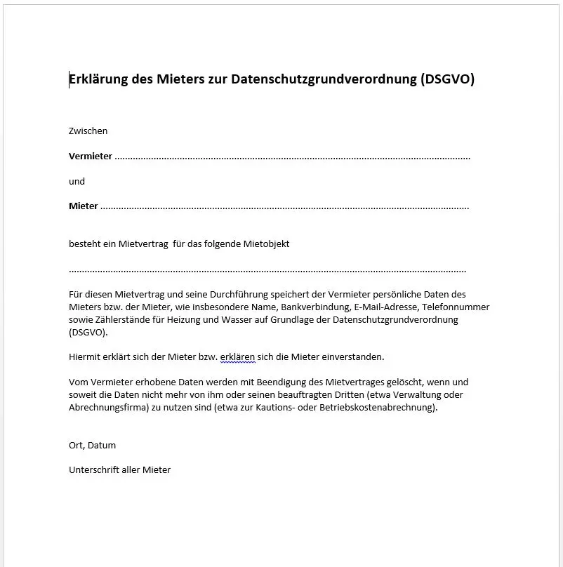 Erklärung des Mieters zur Datenschutzgrundverordnung