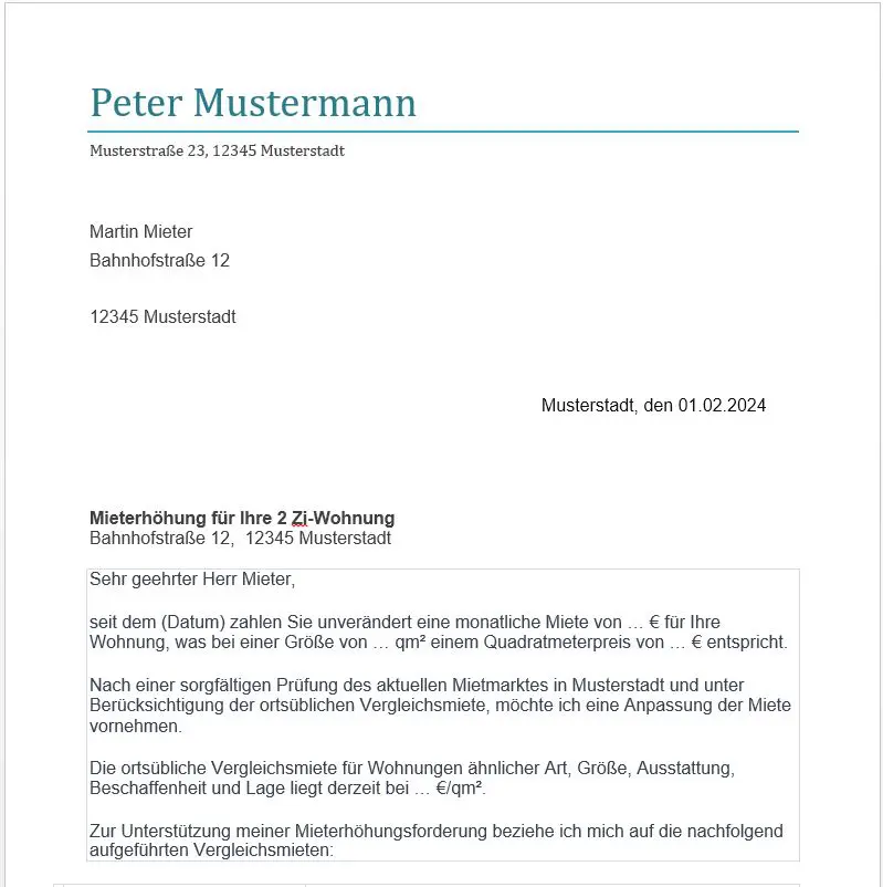 Musterbrief Mieterhöhung unter Verweis auf Vergleichswohnungen